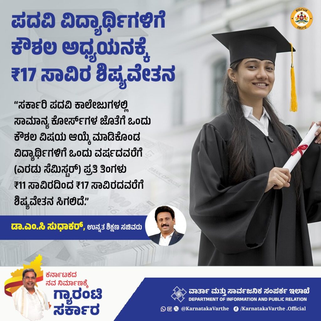 ಬೆಂಗಳೂರು: ಸರ್ಕಾರಿ ಪದವಿ ಕಾಲೇಜುಗಳಲ್ಲಿ ಸಾಮಾನ್ಯ ಕೋರ್ಸ್ಗಳ ಜೊತೆಗೆ ಕೌಶಲ್ಯಕ್ಕೆ ಸಂಬಂಧಿಸಿದ ಒಂದು ವಿಷಯ ಆಯ್ಕೆ ಮಾಡಿಕೊಂಡ ವಿದ್ಯಾರ್ಥಿಗಳಿಗೆ ರಾಜ್ಯ ಸರ್ಕಾರವು 1 ವರ್ಷದವರೆಗೆ ಮಾಸಿಕ ₹11 ಸಾವಿರದಿಂದ ₹17 ಸಾವಿರದವರೆಗೆ ಶಿಷ್ಯವೇತನ ನೀಡಲು ನಿರ್ಧರಿಸಿದೆ.